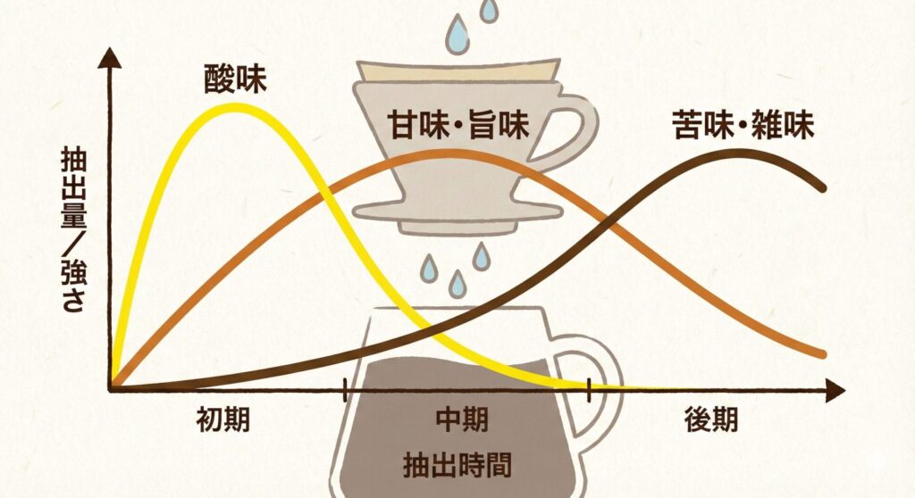 コーヒーの成分が溶け出す「順番」のメカニズムから、酸味・甘味・苦味のバランスを自在に操るための具体的な調整方法まで、初心者から中級者に向けて徹底解説します。
